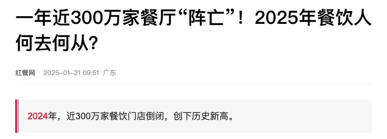 据红餐网数据显示,2024 年国内有近 300 万家餐饮门店关停,这一数字创下历史新高。