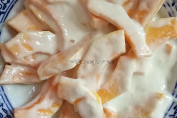 3、将南瓜片放入面糊中搅拌,均匀的挂上面糊。