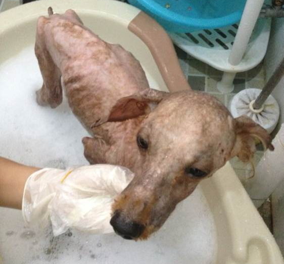 第二天带它去了宠物医院,医生看了都感觉很惊讶,说是从来没有见过瘦成这样的狗,估计以前生活条件还不错,所以流浪后不知道该如何觅食。剃毛之后发现耳朵也缺了一块,可能是被别的狗狗咬的。