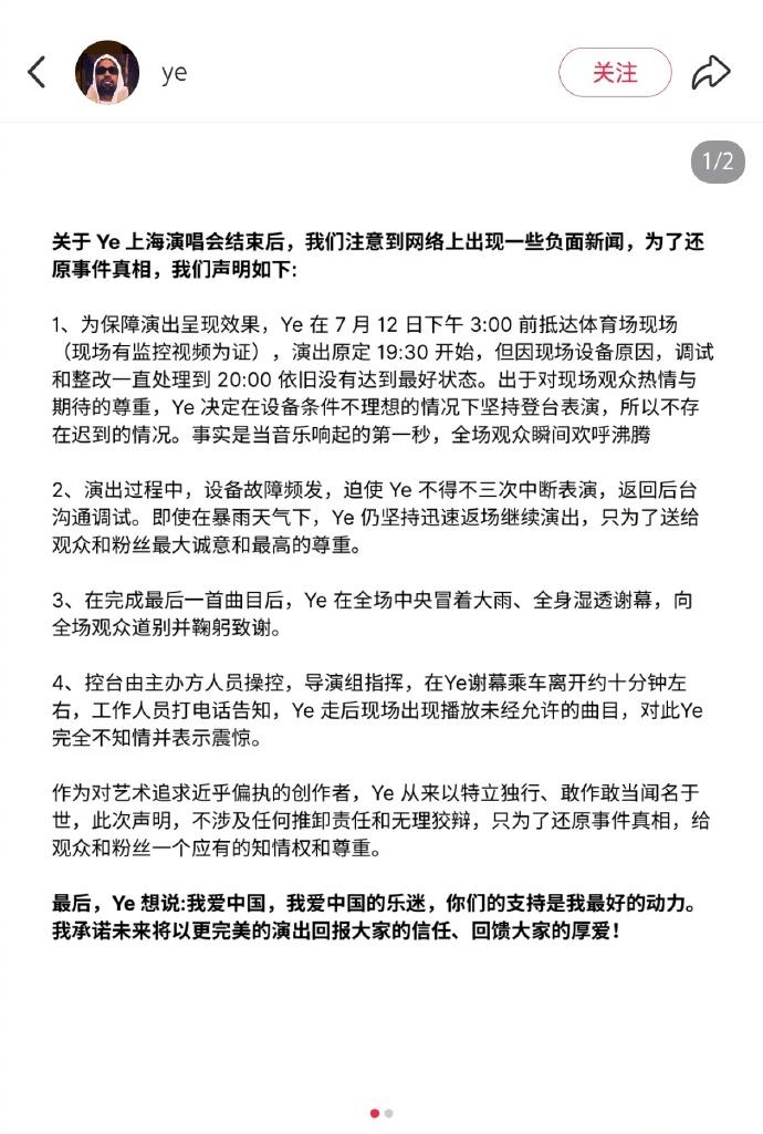 作为对艺术追求近乎偏执的创作者,Ye从来以特立独行、敢作敢当闻名于世,此次声明,不涉及任何推卸责任和无理狡辩,只为了还原事件真相,给观众和粉丝一个应有的知情权和尊重。