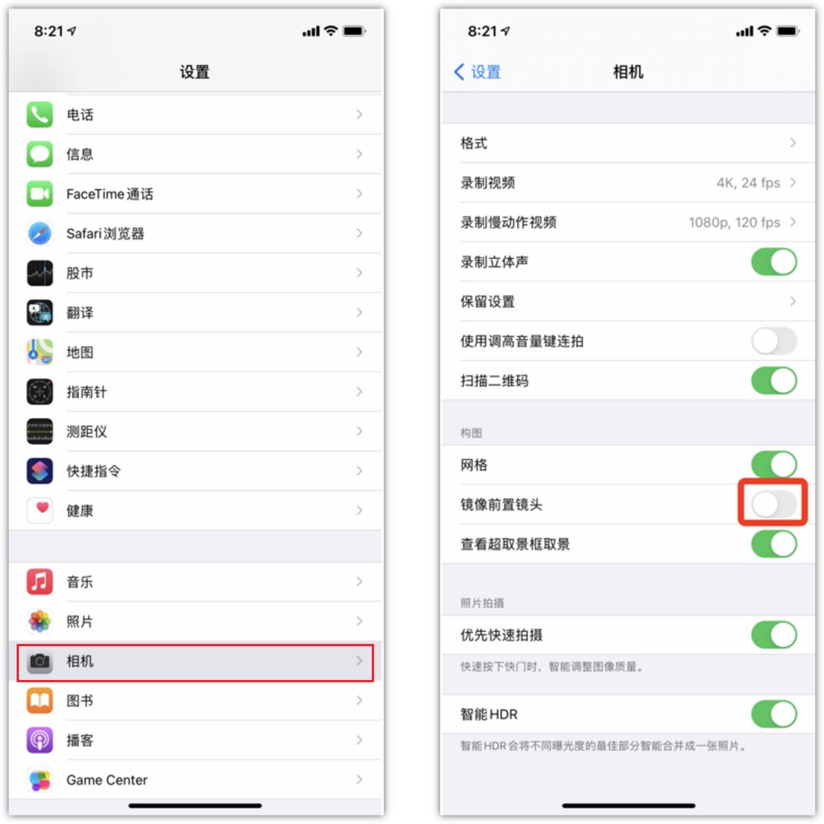 自拍的时候左右是相反的,这一点大家都知道,其实你可以在相机的设置里,开启镜像前置摄像头功能,这样自拍出来的画面跟照镜子的时候一样,能好看不少。