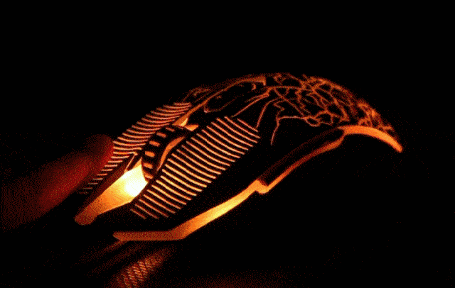 达尔优首次在鼠标上应用了最新的点阵LOGO,与整个背部共用一个光源。鼠标背部绝大部分面积被类肤材质所覆盖,图案以镂空的方式展现,透过灯光笔者感受到了那“炸裂”的图案风格。
