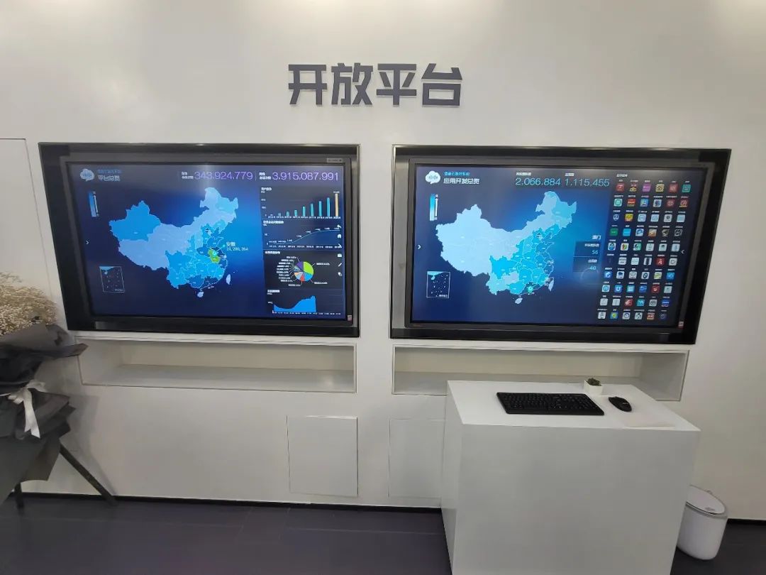 这个区域的两个屏幕上可以看到,全国各个领域以及各种应用软件使用科大讯飞技术的分布情况。而这个平台是科大讯飞在2010年业界发布的以智能语音和人机交互为核心的人工智能开放平台——讯飞开放平台。
