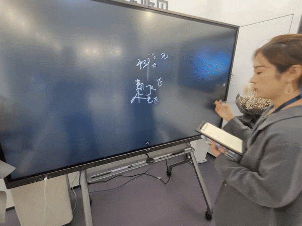 另外,在“讯飞听见”系列产品的最新品——讯飞听见智慧屏中,还可以看到同步书写上屏的技术。智慧屏连接配套的笔记板,手写稿被智能系统实时形成电子版的手稿。