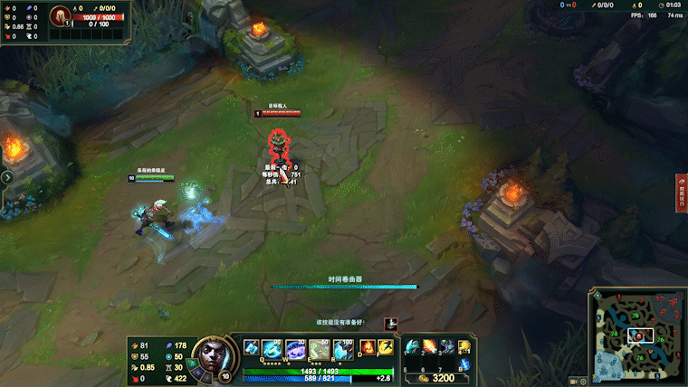 其次要给大家讲一个非常细节的点,当我们到达6级,同时没有视野的情况下,如果蓝量不够了,一定要保证自己有一个释放R的蓝量,也就是100多点蓝,这样在面对敌方打野的Gank时,能够更加轻松的化解。