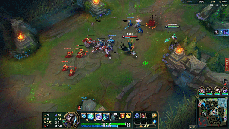 其次是W技能的利用,要增加命中率,我们可以选择卡视野进行释放,墙体、草丛都可以。