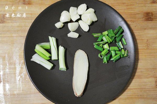 第二步:备菜。菜花清洗干净后,掰成小块。姜洗净后切片,蒜洗净后拍碎。葱洗净后葱白和葱绿分开,葱白切段葱绿切圈备用。