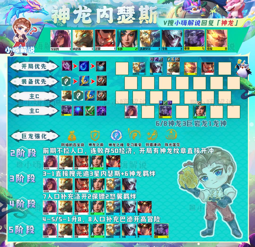 特别是神龙内瑟斯这套阵容,内瑟斯只是阵容前期的一套过渡思路,基本8神龙3星内瑟斯就能够前二,但想要吃鸡,后期还是可以转去玩神龙敖兴,这套强度远远大于四龙神!