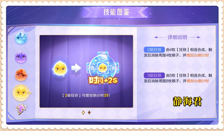 四个狂铁相连后,就会合成一个2级狂铁,触发后会消除4枚棋子,并增加2S的倒计时。