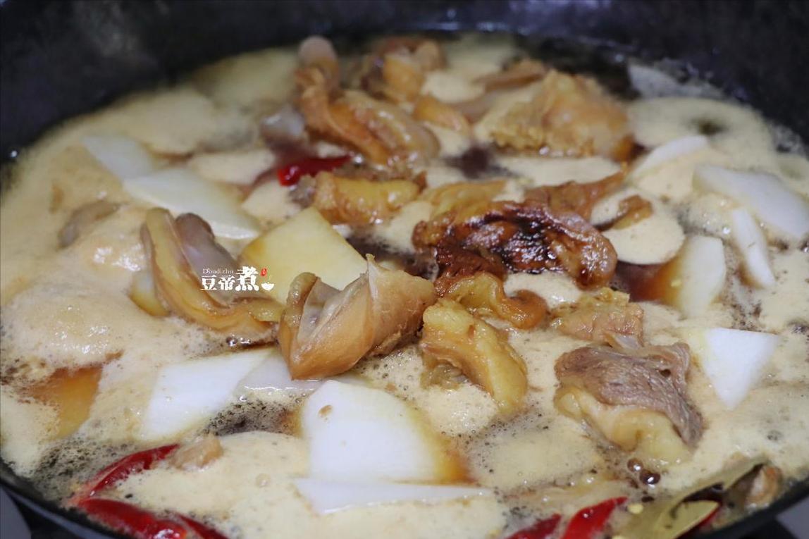 5、然后加入所需要的香料、青葱、蒜瓣,并倒入白萝卜块及调味料。大火煮开之后,转最小火焖煮大致一个半小时后。临出锅前的十五分钟,放入腐竹让其吸收汤汁这样腐竹的味道和口感才会好。