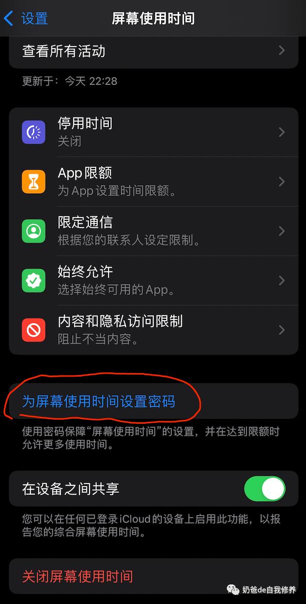 这个密码叫“屏幕使用时间的密码”,和“解锁密码”不是一回事。所以,不要把它设置成和解锁手机的密码一样的啊!设置了屏幕使用时间的密码之后,修改屏幕使用时间中的设置都需要密码,这样孩子就改不了设置了。