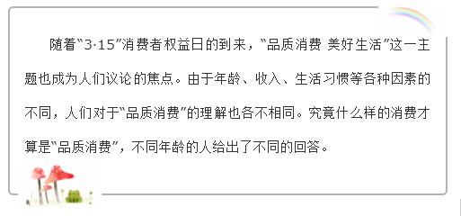 “中年人有了稳定的收入,消费关注也就会更多的偏向品质,特别是一些大项目,我个人觉得既然要买就一定要买品质有保障的。”采访中,不少中年阶段的消费者如是说。对于很多老年人来说,“品质消费”更多的是大超市里的打折商品,虽然即将过期,虽然已经不新鲜,但是并不影响使用,重要的是打折之后价格更便宜些。