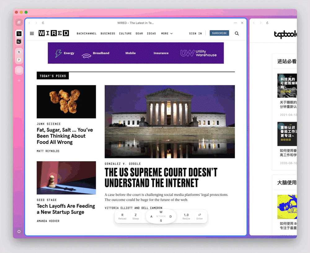如果你喜欢 Stack 的设计风格、卡片堆叠式的网页管理和多窗口并行的模式,或者想要养成分门别类的网页浏览习惯,那值得一试。但 Stack 目前好像无法铺满整块显示屏,可能也会让一些强迫症用户望而却步。同时,一些网页并不能很好地自适应宽度,所以你难免会遇到这样的情况(缩小卡片占比页面不适应大小,比如百度)