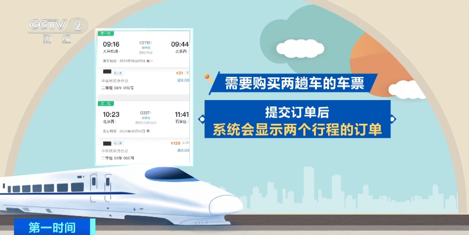 以一张大兴机场开往石家庄的车票为例,车票上显示的中转车站为“同车换乘”,这就表示不用下车,即可完成换乘。这种“特殊情况”的中转换乘是需要购买两趟车的车票,提交订单后,系统会显示两个行程的订单。举个例子,C2712次列车到达北京西站后,只需从08车厢前往03车厢,找到对应的座席即可。