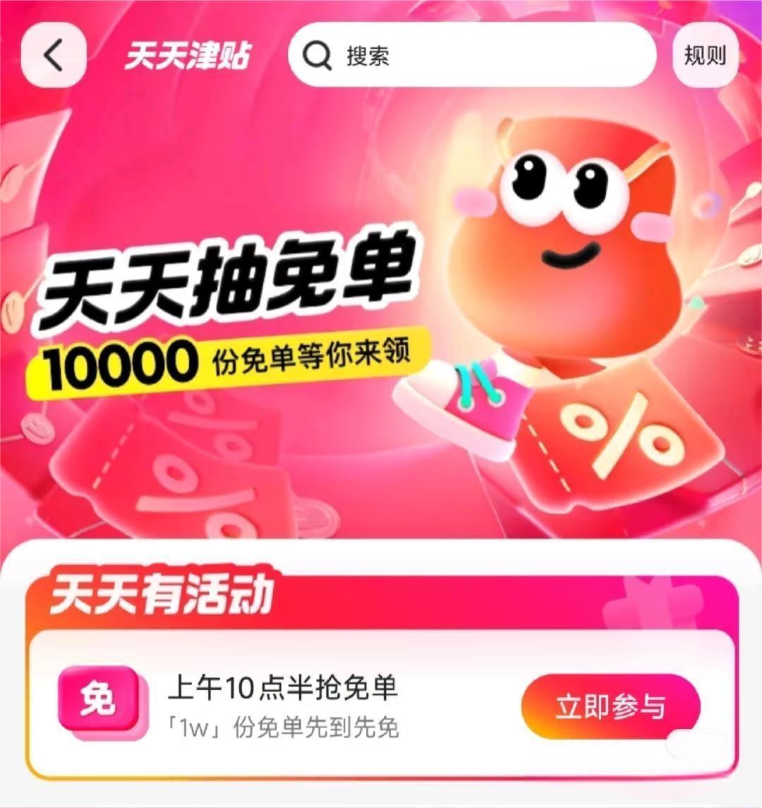 本周活动时间为2025年7月8日至13日,除周三(7月9日)外,每日上午10:30至中午12:30限量发放1万份免单,前1万名确认收货的订单可享100%免单,先到先得,发完即止。周三(7月9日)当天限量发放10万份免单。