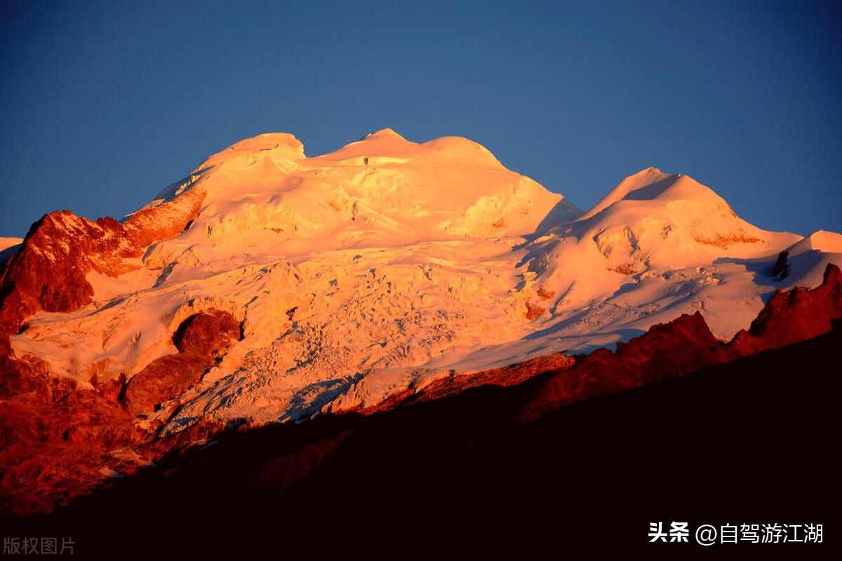 这个高山垭口就是海拔4600米的劳者弄巴垭口,处于格聂神山主峰的正西面,现在时间大约是下午6点,在等上一会,随着太阳的西沉,格聂神山前面的草甸金黄一片,格聂主峰也将由雪白变成黄色,又变成红色,当太阳完全淹没于地平线后,格聂主峰又变回了白色,这就是格聂神山的日照金山,一个让你激动不已的场景,这也是我们要下午离开巴塘的原因。