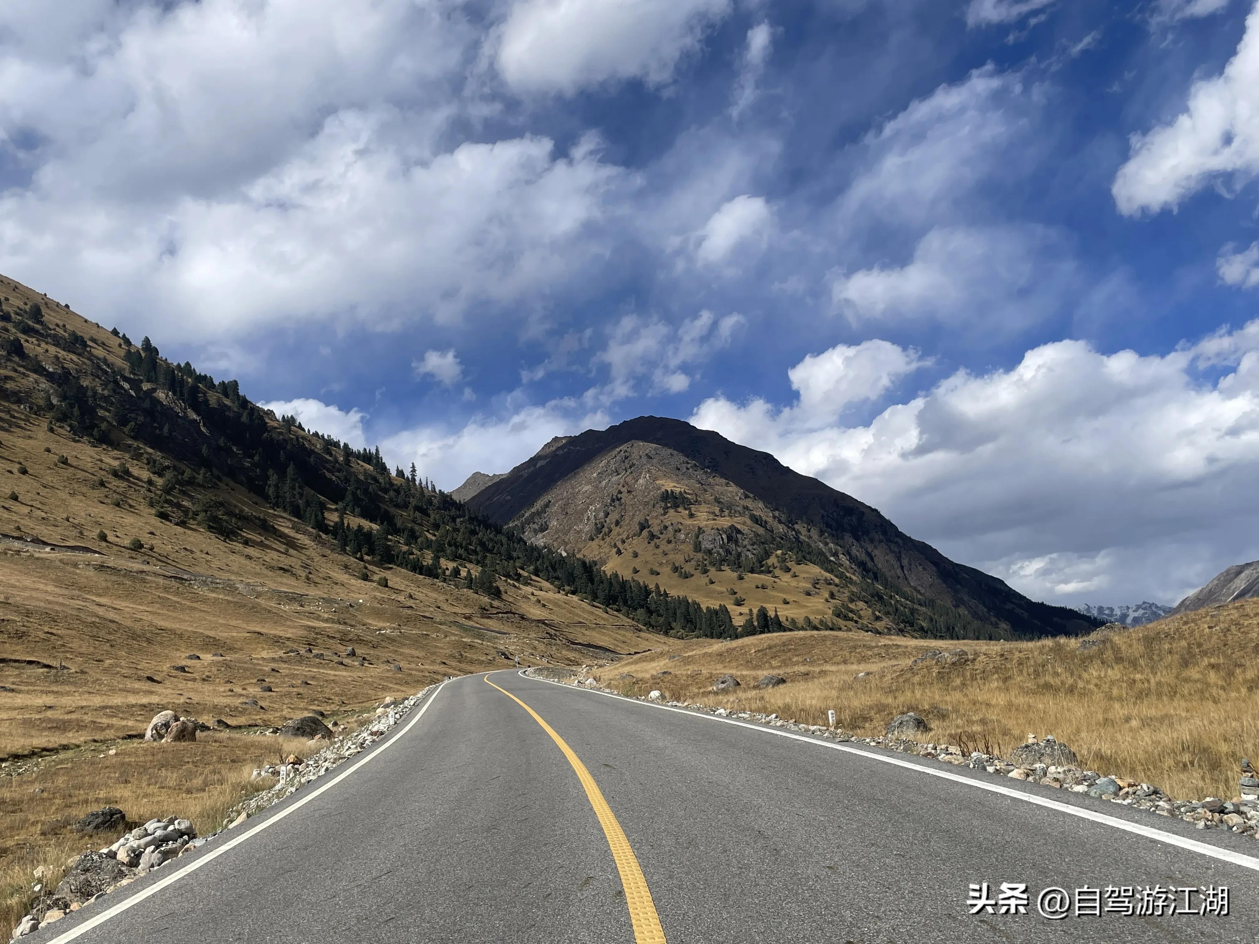 翻过扎瓦拉垭口后,459省道路况非常完好,道路也没有刚才那么曲折,可以一边轻松地开着车,一边欣赏车窗外的蓝天白云,路旁的秋色。