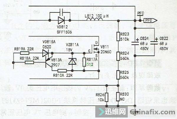 原因:本机采用RSAG7.820.4782电源板,常见原因是PFC电压取样电阻R826 、R827 、R828漏电,取下清洁后重新焊上即可,故障时测PFC电压低于380V。