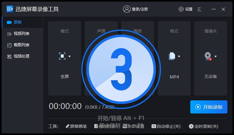 第三步:完成声音设置,点击“开始录制”,等待三二一倒计时结束,正式开始录制;