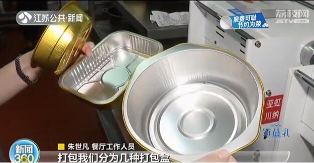 这里的打包分为几种打包盒,一个是大的锡纸打包盒,可以压膜,是带汤的。另外一个是环保打包盒,分开打包,干湿分离,回去直接加热一下就能直接食用,很方便。