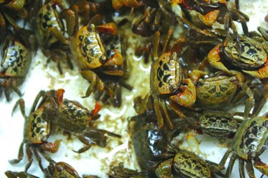 在潮汕,能被大量捕捉,代替园蔬并拿到市场贩卖的也只有“瘪蟹”这种字纹弓蟹。“瘪”,潮州音为“米”字第四声,意思是扁平或不饱满,如鼻梁不高称“瘪鼻”。“瘪蟹”是一种“形方而扁”的小蟹,与旧志记载的“拔蟹”相同。估计当年主编县志的县令是外省人,才用了个近似音的“拔”字来代替方言的“瘪”字。