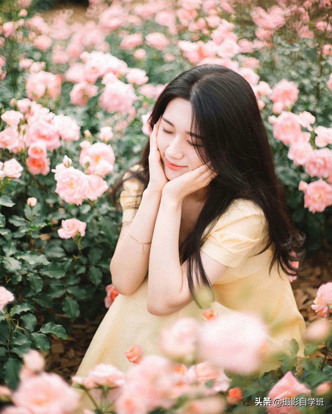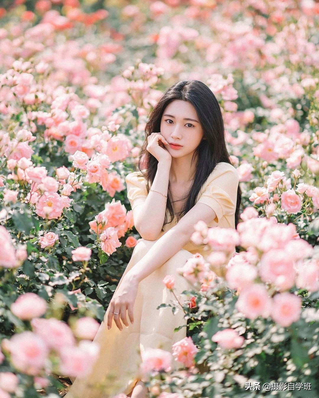 下面就是介绍,在同样的一个场景,怎么能够拍出更多好看的照片呢?这里就需要你的姿势丰富,如果你是摄影师,就需要引导模特,摆出不同的姿势,或者表情。像上面这张照片,不看镜头,手搭在前方,值得你模仿。还可以走到花丛深处,坐在地面,一个手拄着下巴,一个手搭在前方,这种姿势看起来,也非常优雅。