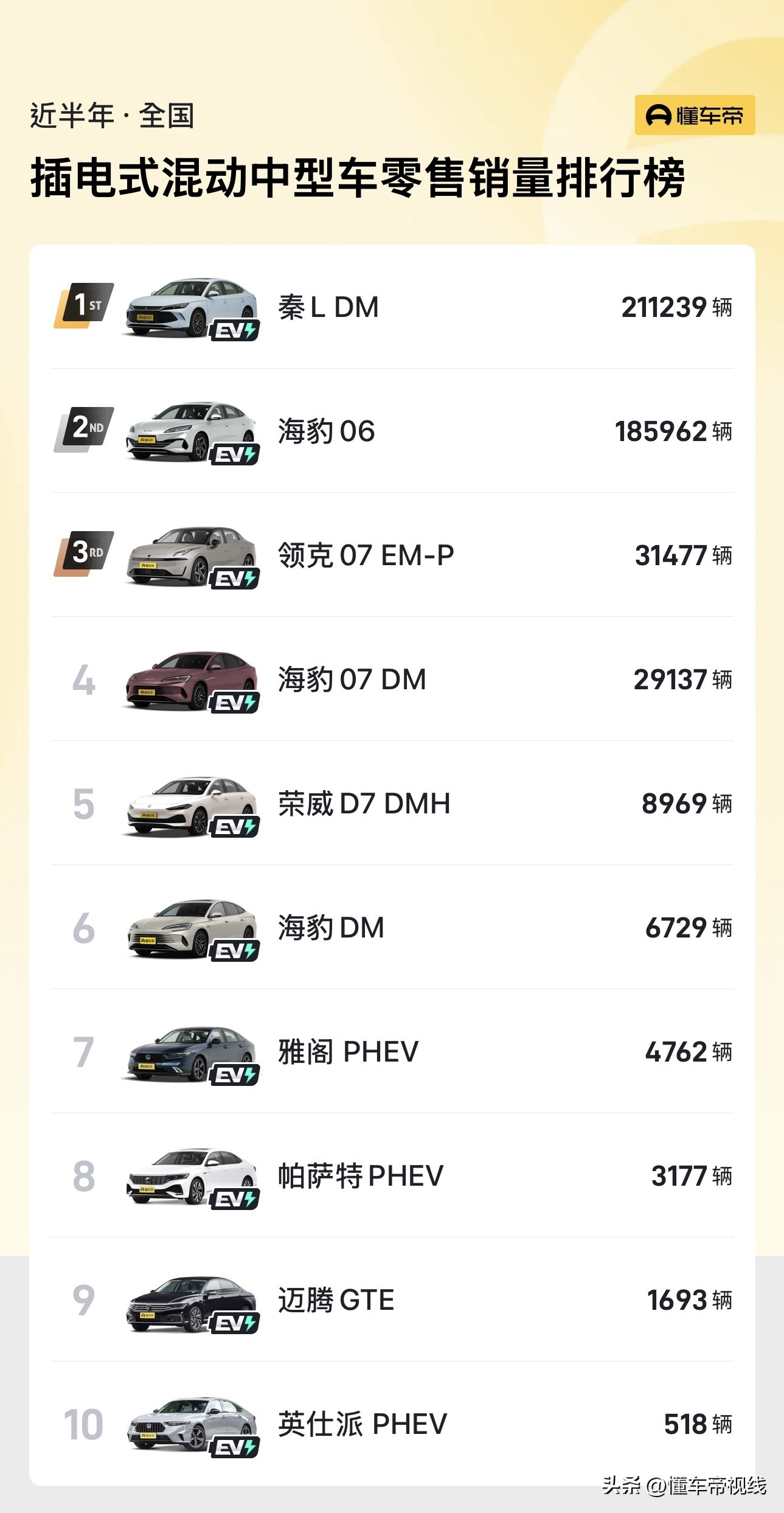 比亚迪秦L DM-i定位于插混中型车,根据车型级别以及定位来看,同级车型包含比亚迪海豹06(指导价格区间为9.98万-13.98万元)、荣威D7 DMH(指导价格区间为12.38万-14.58万元)等。根据销量数据显示,近半年比亚迪秦L DM-i销量为211239辆,销量在该级别排名第1位。更多消息,懂车帝将持续关注。