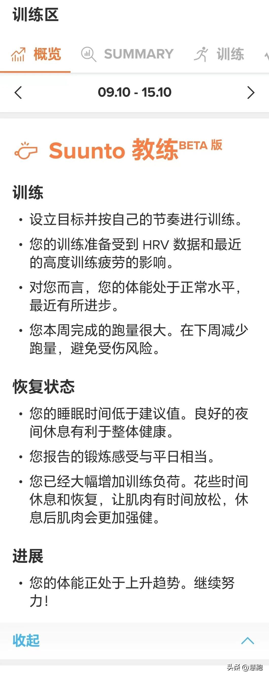 对于不太关心Suunto 训练区的用户,Suunto AI教练在训练区概览板块,用简明扼要的语言,提供一周的训练、恢复状态与进展分析及建议,还可以看到训练负荷、强度、训练量、影响、恢复状态(包含HRV、体能状态、睡眠、感觉四项,其中感觉获得需要每次训练与比赛前在手表上锻炼模式项目里设置开,结束后进行自我评估)、进展(体能水平、CTL)六项更具体的分析。