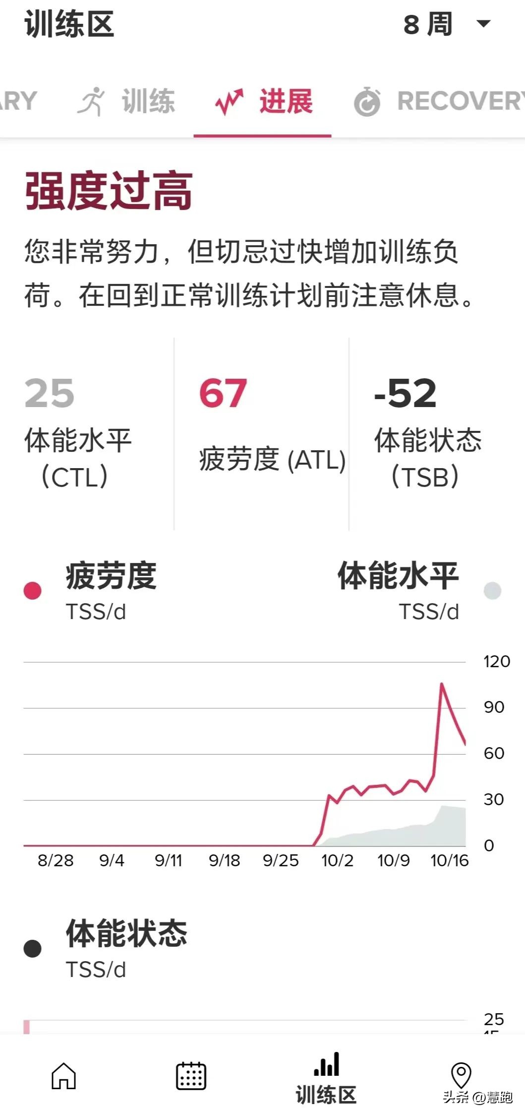 点击Suunto App底部选项卡之训练区可以看到概览、训练、进展、RECOVERT、睡眠等7栏,在进展栏可以看到相关体能水平(CTL)、疲劳度(ATL)与体能状态(TSB)三个参数的详细数据。