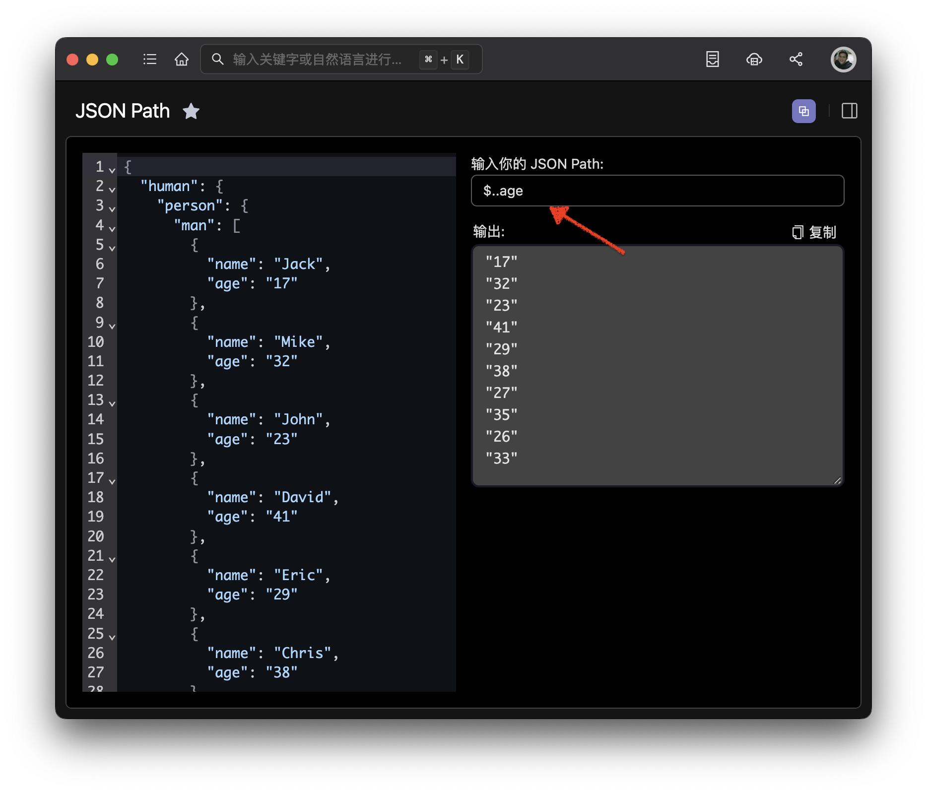 对于 $..name,我们就知道它表达的是”返回 JSON 数据中所有层级中具有 name 键的值“,那么如果我们要获取所有 age,则可以改成 $..age: