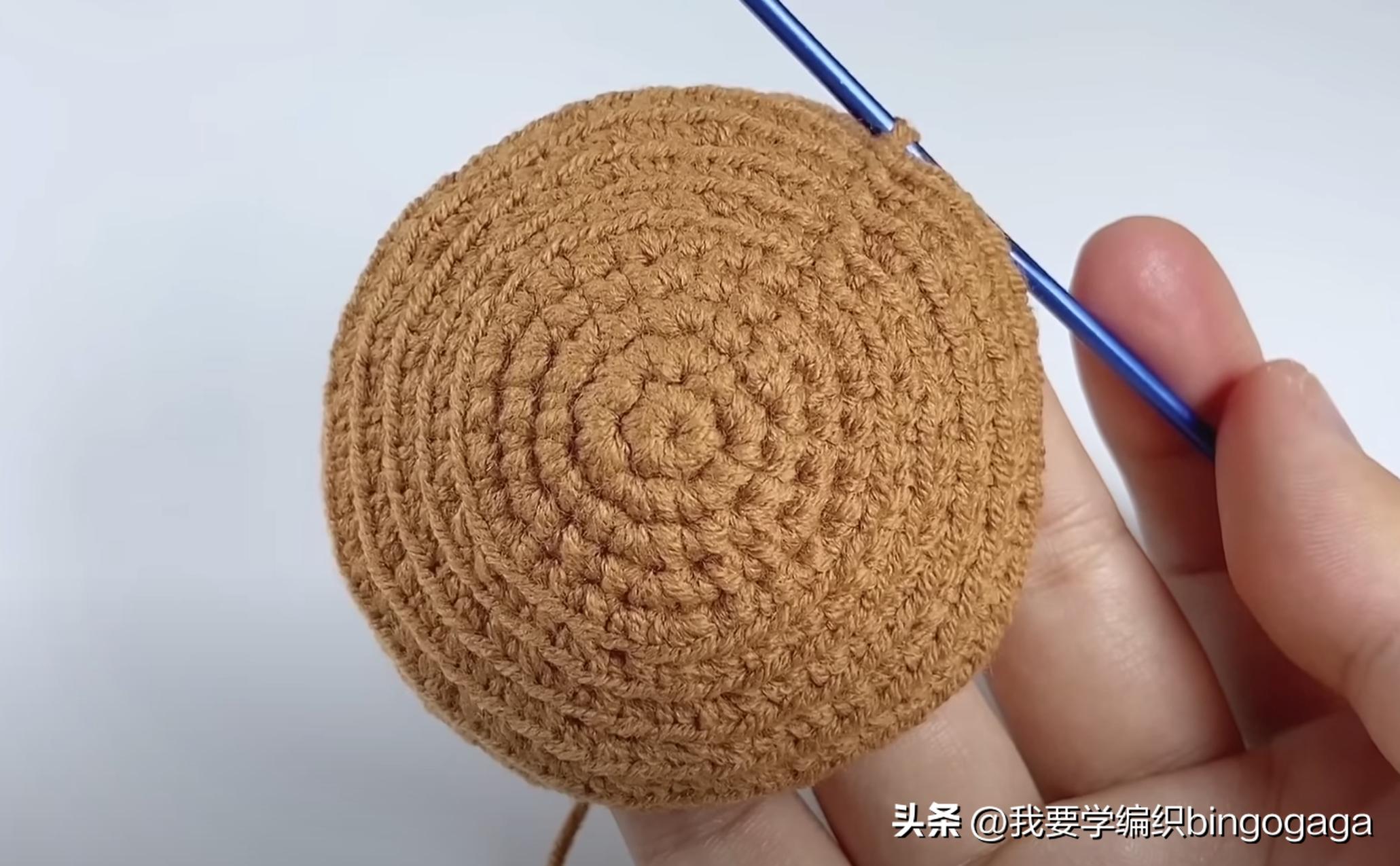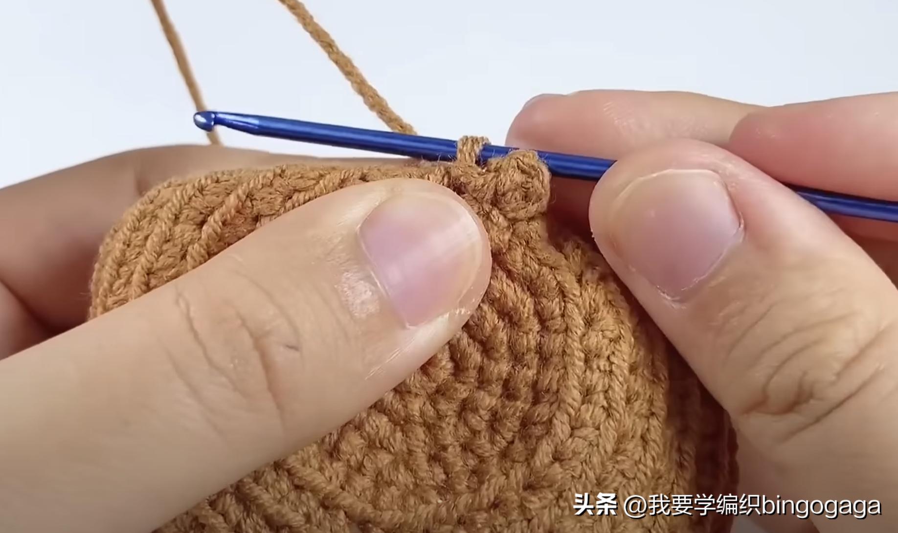 先用深咖线来钩花蕊部分。第1圈:环起,钩6短(每圈引拔);第2圈:2短*6,12针;第3圈:(1,2)*6,18短;第4圈:(1,1,2)*6,24短;第5圈:(3个1,2)*6,30短;第6-10圈:都是挑后半针来钩;第6圈:(1,1,2,1,1)*6,36短;第7圈:(5个1,2)*6,42短;第8圈:(3个1,2,3个1)*6,48短;第9圈:(7个1,2)*6,54短;第10圈:不加不减54短。