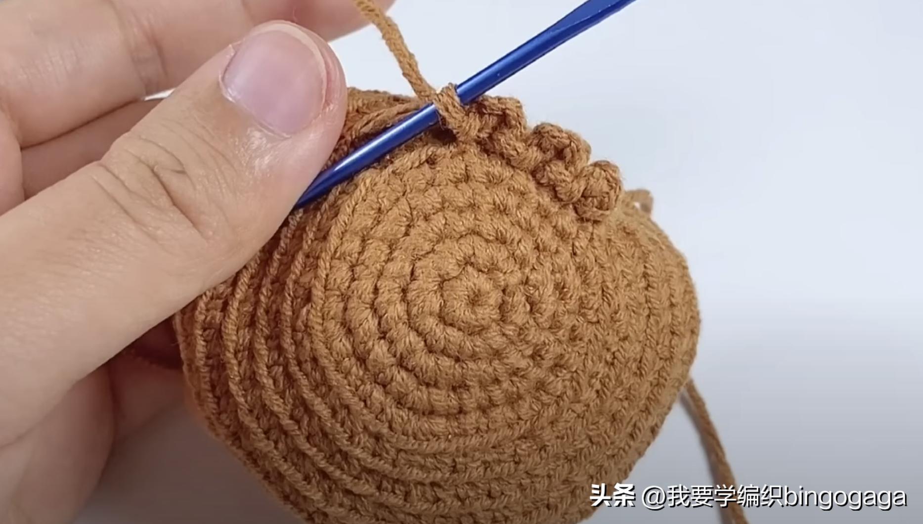 换浅咖线钩种子部分(挑第6-9圈剩下的外半针来钩)。第1圈:从花蕊第6圈的任意外半针入针,这针里钩3锁1引拔针,再跳过第2针,第3针起重复2针的花样(第1针上钩1引拔针3锁1引拔针,跳过第2针),最后与第1针根部针引拔。第2圈:挑下1圈对应的外半针引拔,接着重复刚才那圈的钩法钩完整圈。再按一样的方法向后钩出2圈,共有4圈。
