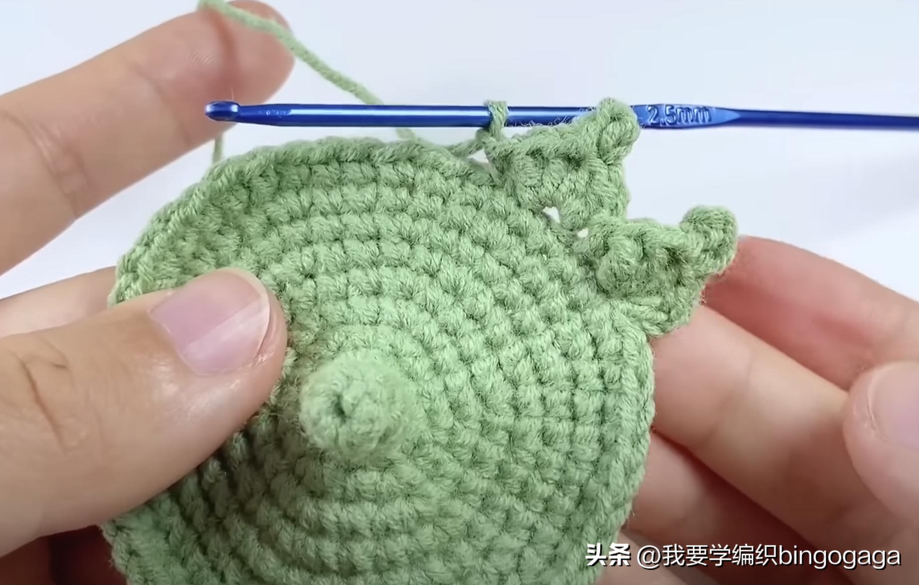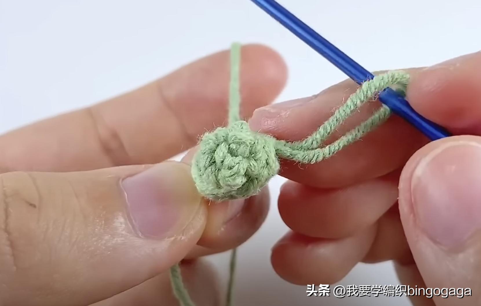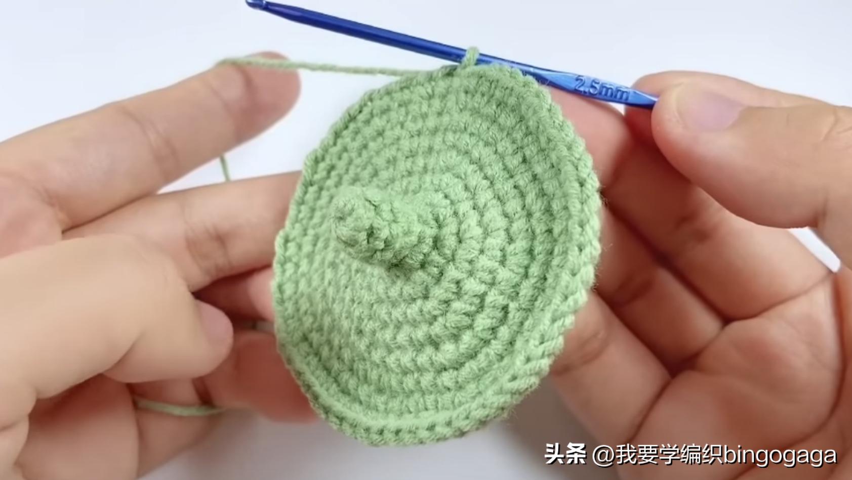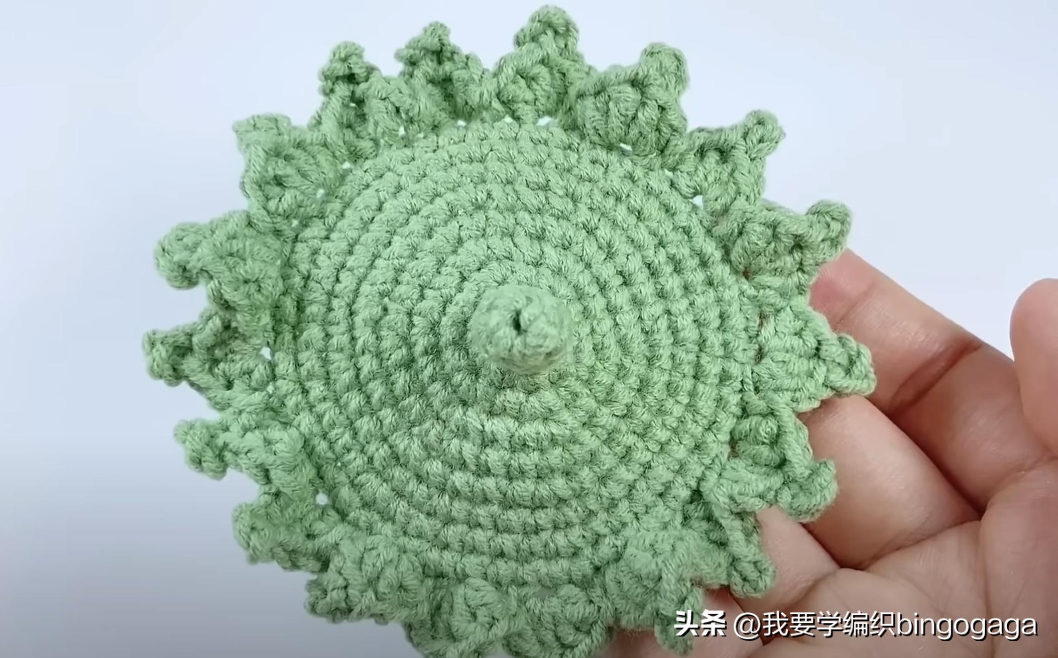 接着用绿色线钩花托。第1圈:环起,6短;第2-3圈:不加不减6短;第4圈:2短*6,12针;第5圈:(1,2)*6,18短;第6圈:(1,1,2)*6,24短;第7圈:(3个1,2)*6,30短;第8圈:(1,1,2,1,1)*6,36短;第9圈:(5个1,2)*6,42短;第10圈:(3个1,2,3个1)*6,48短;第11圈:(7个1,2)*6,54短;第12圈:挑前半针来钩,2锁,从第1针开始,重复3针的花样(第1针上钩2长3锁的狗牙针2长,第2针上钩1引拔针1锁,跳过第3针),最后与第1针长针引拔,断线。