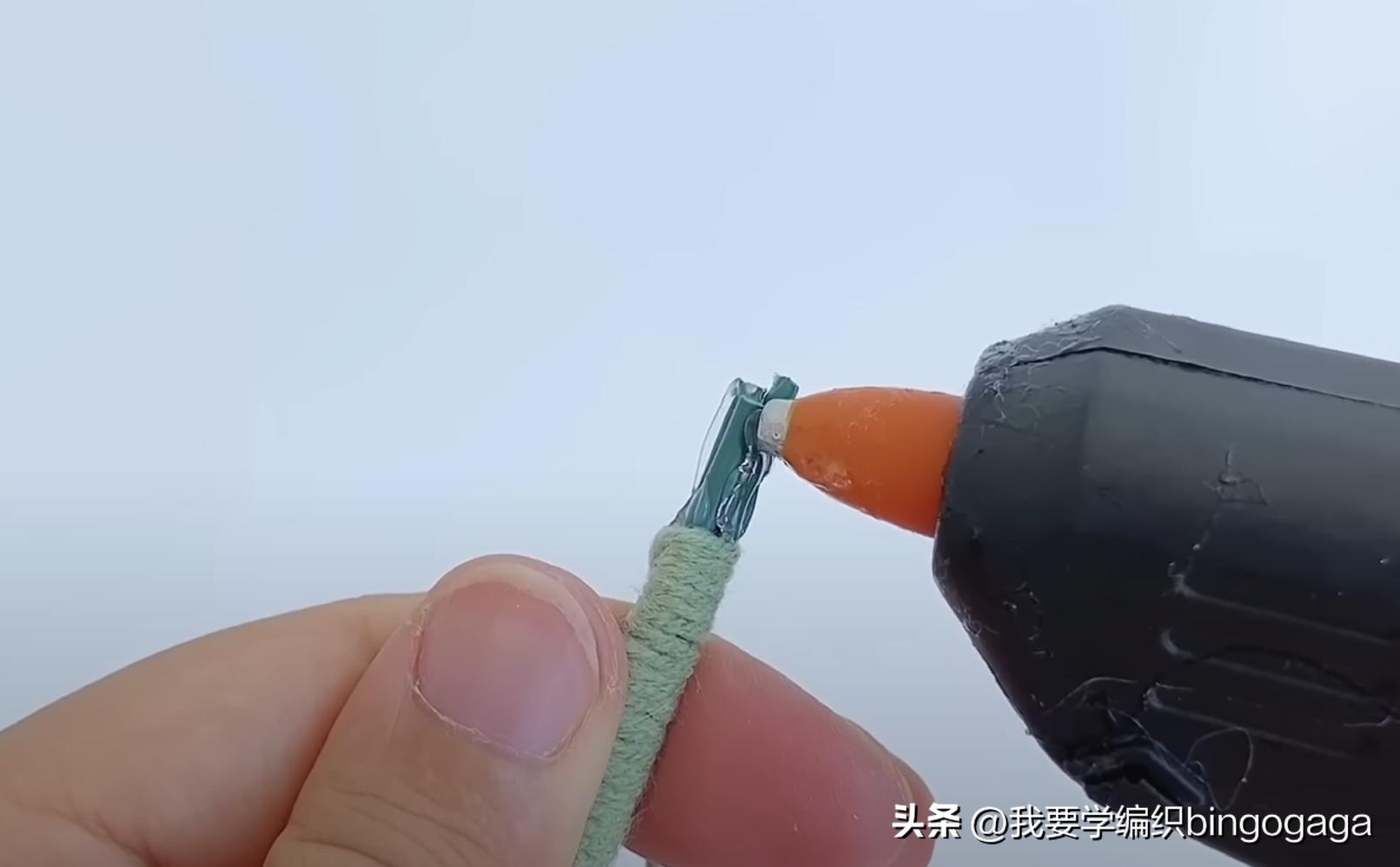 然后来钩叶子。第1圈:环起,7短(每圈引拔);第2圈:2锁,7针依次钩(3长*1,2长*2,3长长*1,2长*2,3长*1),2锁,与第1针根部针引拔(共17针);第2圈:直接从钩针上的线圈中穿入定型条,2锁,依次钩(1短1中长*1,3长*1,2长*6,3长*1,2长*6,3长*1,1中长1短*1),最后1锁,与第1针根部针引拔(共37针);第3圈:1锁(这圈不用包定型条,依次钩:1短*1,1中长*1,2长*5,1长*11,1长1长长2锁的狗牙针1长长1长*1,1长*11,2长*5,1中长*1,1短*1,与第1针根部针引拔,断线,用线头缠绕一段下方的定型条。