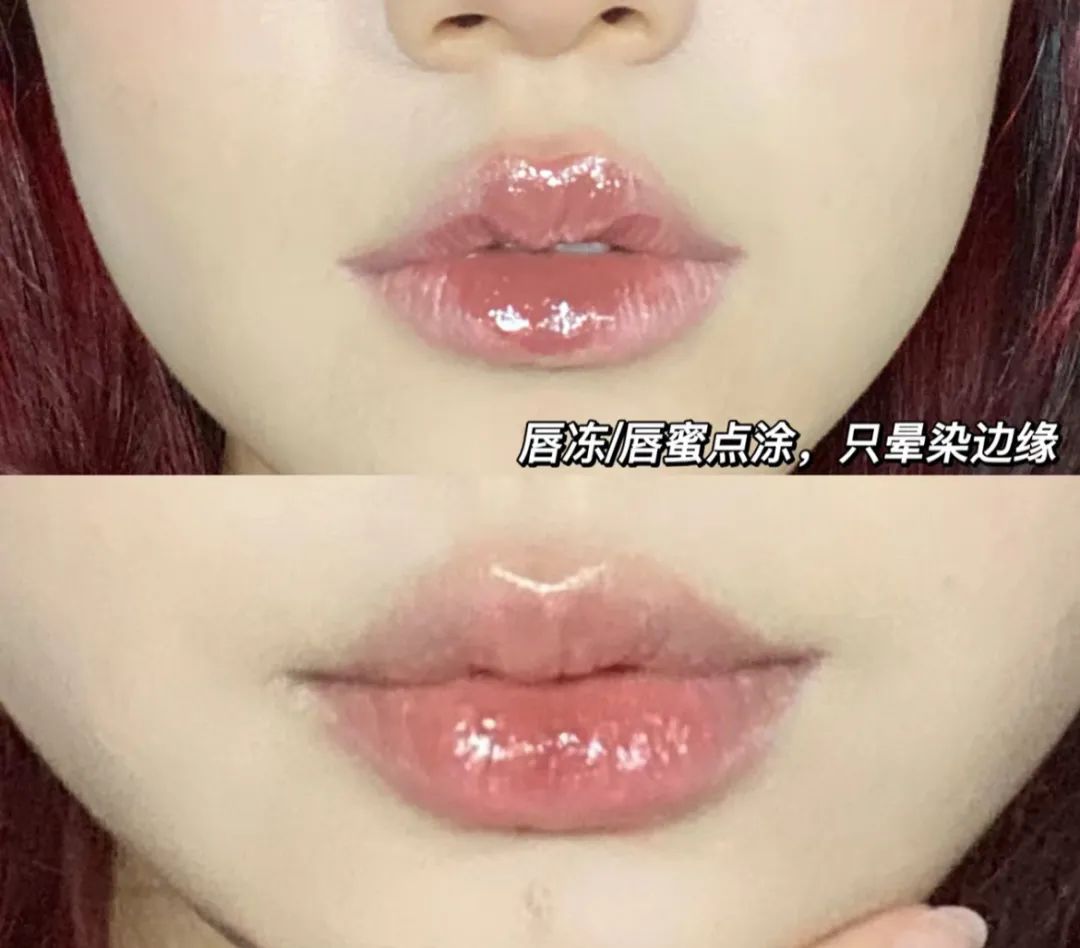 第二步,用【半透明的唇釉,或者唇蜜】,顺着刚刚的层次再来一遍,点涂一下,把边缘晕开即可。