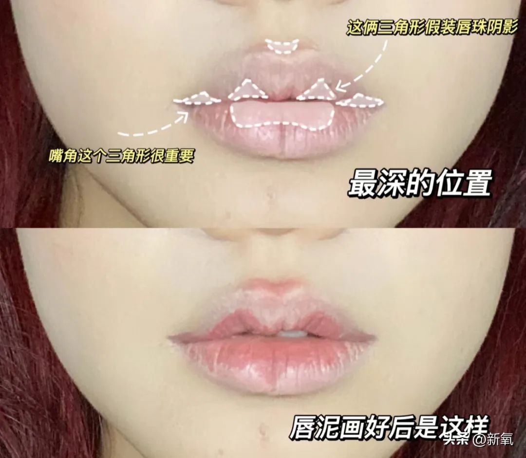 第一步,嘴巴打底,然后用【哑光唇釉或者唇泥】画出嘴巴的层次,晕染开。