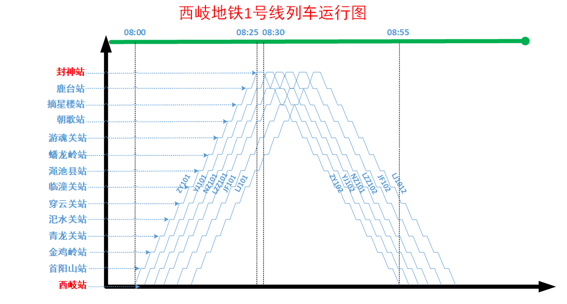 08:00出发的列车,在08:25抵达了终点,接下来乘客下车,列车掉头,花费5分钟时间,于是在08:30,准时返程。返程时间同样为25min,最终在08:55重回始发站“西岐站”。