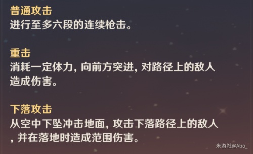 普通攻击共造成六段连续枪击,重击则会向前突刺一段距离。