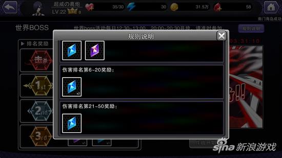 需要注意的是,世界BOSS每天有两个开放时间段,分别是12:30——13:00、20:00——20:30,大家想要参与这个玩法的话,一定要记得在活动开启的时间内参与哦。