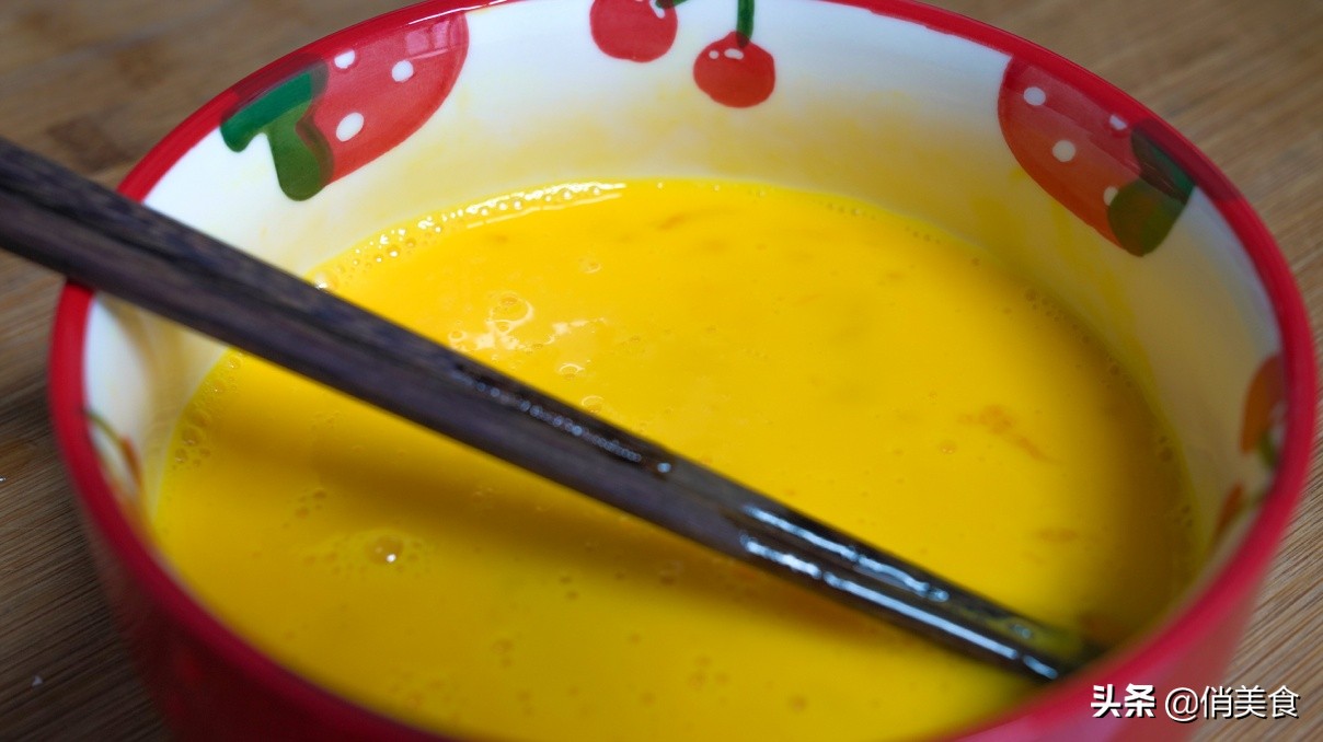 第四步:接下来准备一个碗打入2个土鸡蛋,把鸡蛋液搅碎,炒锅内少来一点油,蛋液倒入锅中,鸡蛋液定向后炒成鸡蛋碎。
