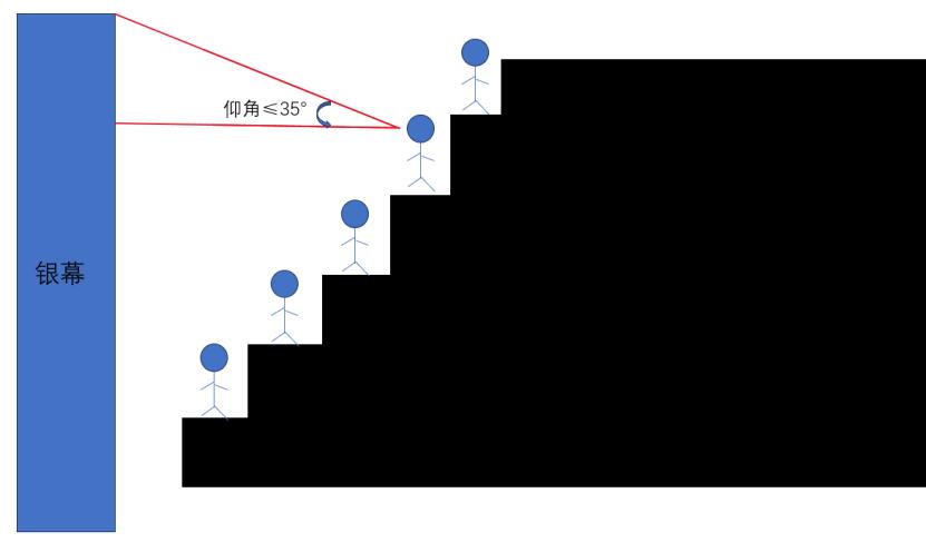 其次,为了避免造成颈椎疲劳,观众与银幕水平线之间的仰角不宜超过35°,示意图如下: