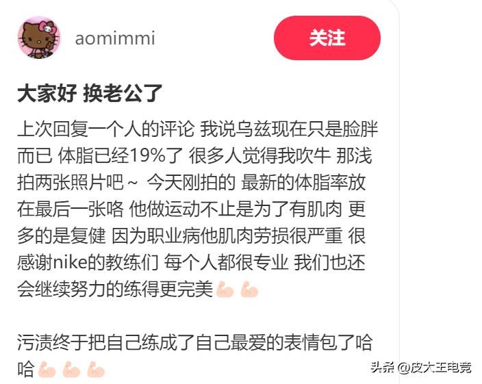 不过从奥咪咪公布的这组照片可以看到,UZI不仅减肥成功,更是练出了腹肌,和以前的那个小胖子比起来差距真的很大,也难怪奥咪咪会说自己“换老公了”,而奥咪咪也表示UZI在打职业阶段,肌肉劳损十分严重,而做运动不仅是为了练出肌肉,更多的目的是为了复健。