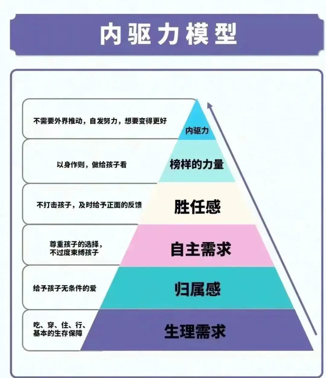 心理学家德西(Deci)和瑞恩(Ryan)提出,人的内在动机源于三种心理需求的满足:自主感(选择权)、胜任感(能力认可)、联结感(情感支持)。若这些需求被忽视,孩子可能依赖外部压力(如奖励或惩罚),而丧失内在动力。