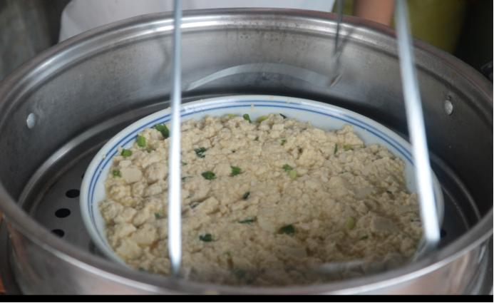 锅中加水、上汽以后豆腐放进去蒸5分钟左右、这个时间在准备辅料、猪肉剁成肉末、猪肉不要用绞肉机打、用刀剁出来的猪肉能大程度的保证口感、小葱切成葱花、姜末。