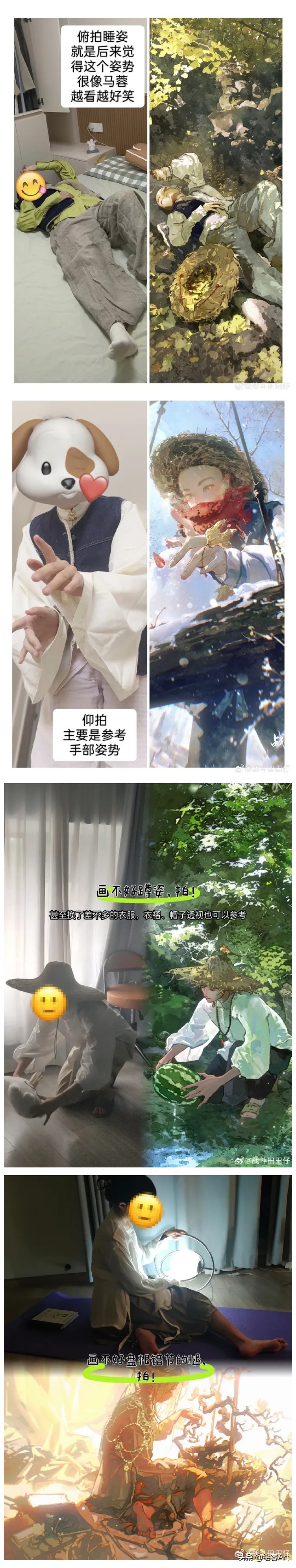除了绘画本身的一些技法、思路分享,超有分享欲的田田仔还倾情分享了丰富自己动作素材库的小妙招——自己cos自己的OC。主打一个重在参与,沉浸式体验。