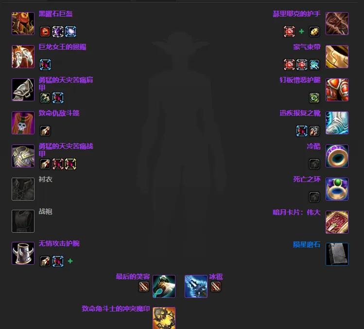 归乡纹章替代品:头部-T7套装,项链-愚者的试炼,手套-T7套装,戒指2-强力指环,饰品1-死亡之钟,饰品2-五色巨龙之怒,主手武器-恐怖之怒。