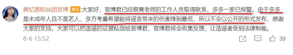 有消息称,目前当事人黄磊一家已经报警了,但是由于黄多多是未成年人并且不是艺人,综合多方面考量希望将谣言带来的负面影响降到最低,所以不会以公开的形式发布。