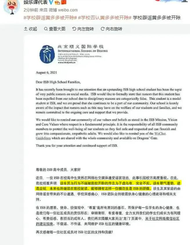 但是,此消息一出来没多久,就被黄多多就读的学校ISB官方辟谣了。
