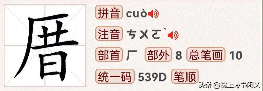 从厂。昔声。苍各切,又七互切。五部。按,许书厝与措、错义皆别。而古多通用。如“抱火厝之积薪之下”,假厝为措也。