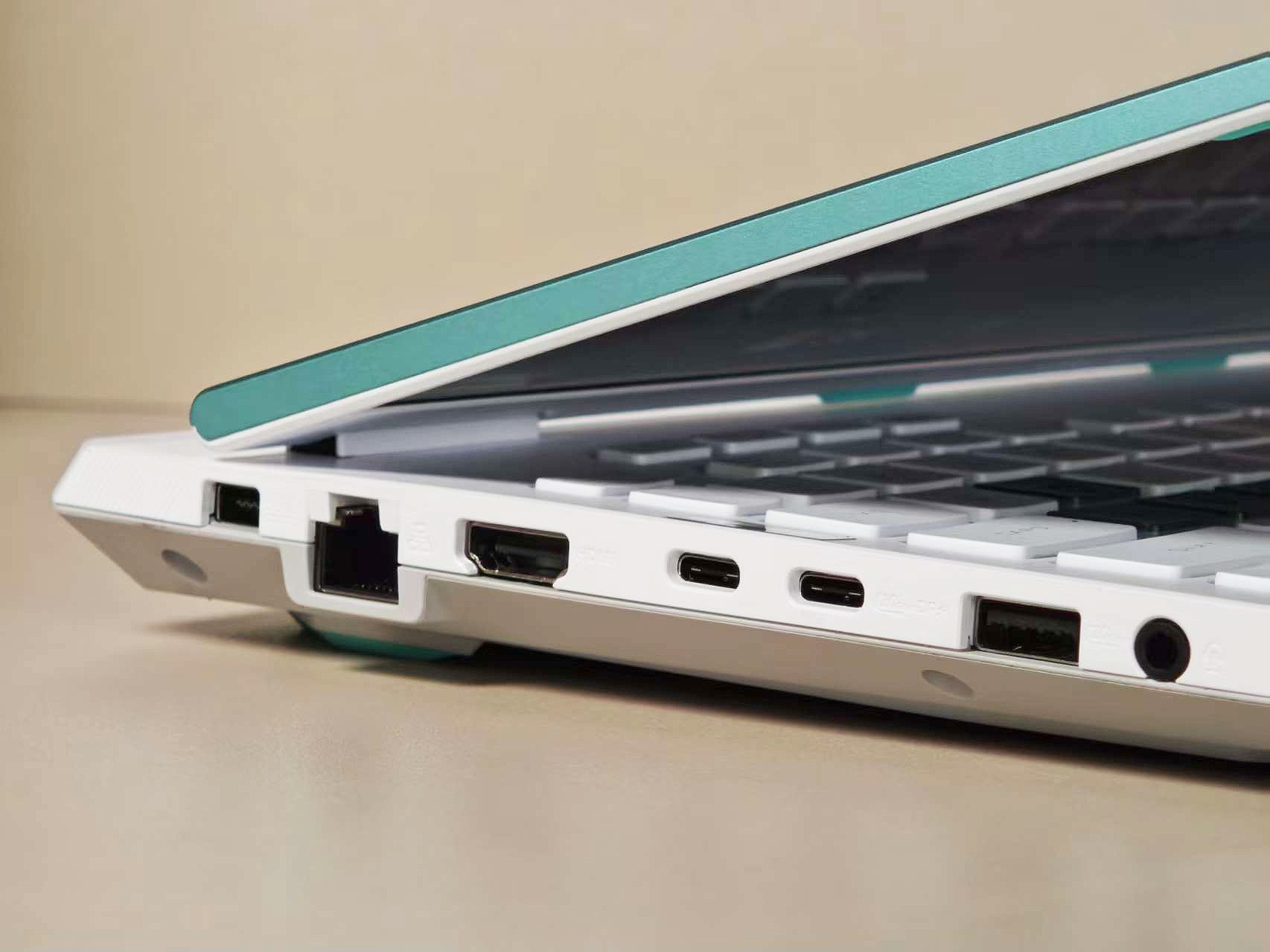 左侧自上而下,依次为电源接口、RJ-45网线接口、HDMI接口、两个USB-C接口、一个USB-A 10Gbps接口和3.5mm音频口,一个雷电4口和一个10Gbps USB-C接口,标有闪电图标的还支持PD充电;右侧为两个USB-A 10Gbps接口,方便插拔鼠标和各种外接设备。